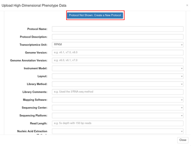 Click the “Upload Transcriptomics Data” button to open the upload workflow dialog. On the second step “Samples”, you will be prompted to make sure that your samples are already in the database. You can refer to the “Managing Tissue Samples” chapter for instructions on how to create a sampling trial. After creating a sampling trial or confirming that your samples exist, move on to the “Protocol Info” step. Here you can select an existing protocol, or create a new protocol. To create a protocol, click the “Protocol Not Shown. Create a New Protocol” button. From here you can fill in information about your new protocol and when finished, click “Go to Next Step”.