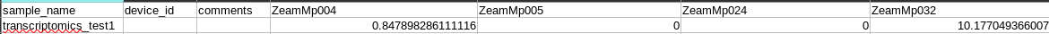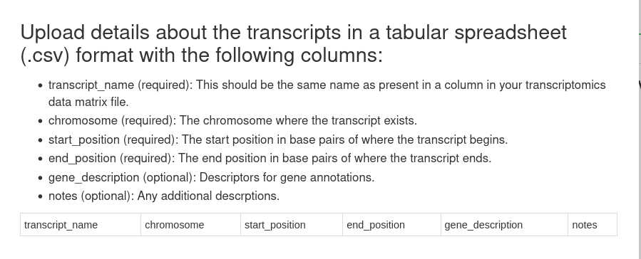You will need to have two csv files when uploading transcriptomics data. The first is the data matrix file, which should have these headers: