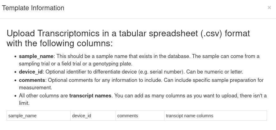 The names in the sample_name column should match the sample names you created in your sampling trial file. The header marked “transcript_name_columns” should be replaced with the transcript names you want to upload, each in its own column in the header and the respective expression value below. Example: