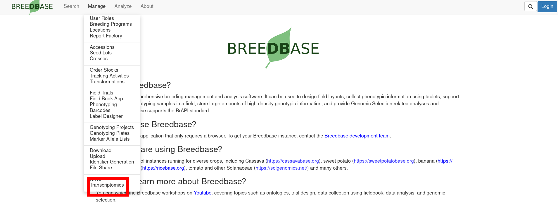To upload transcriptomic data, go to the transcriptomics page by clicking “Transcriptomics” under the Manage tab.