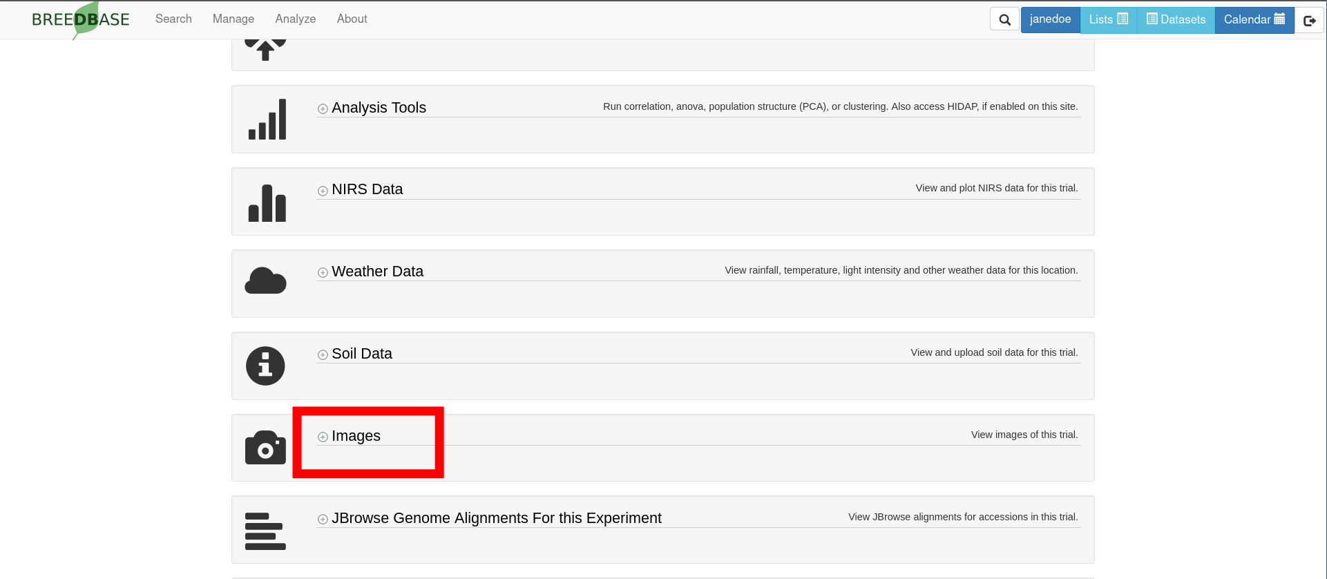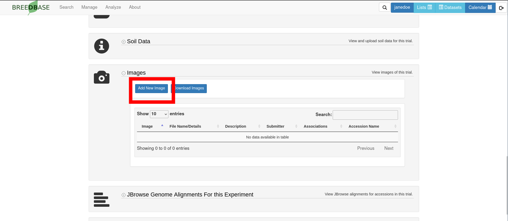 Another way to upload images is through the field trial details page. Navigate to a field trial details page and open the “Images” section.