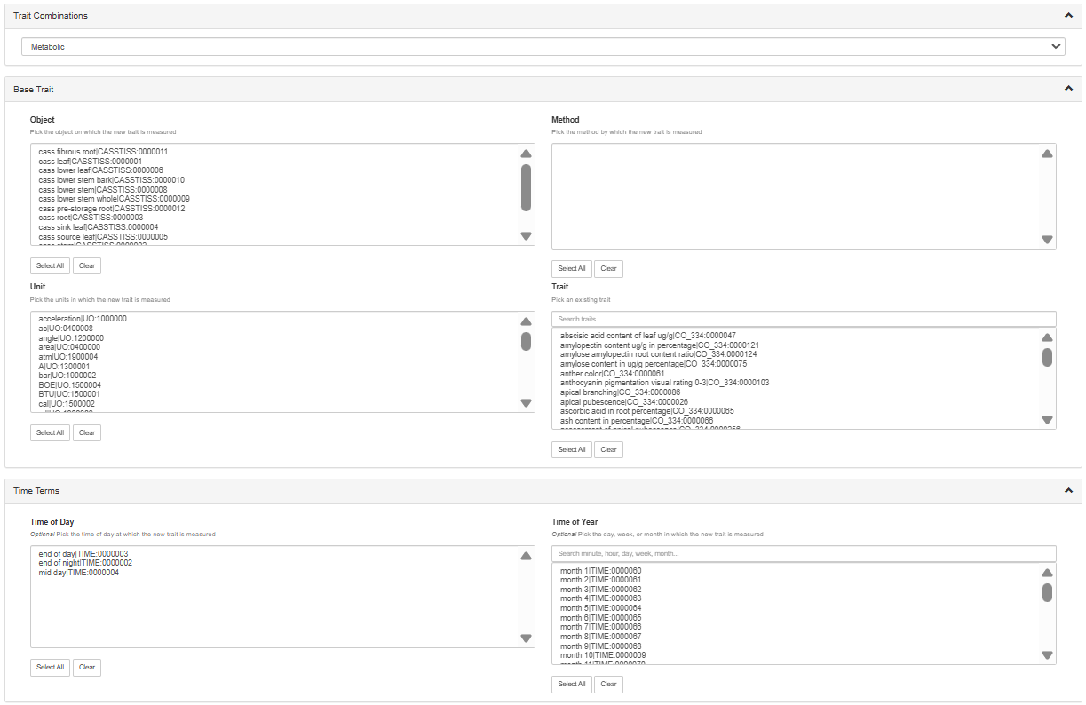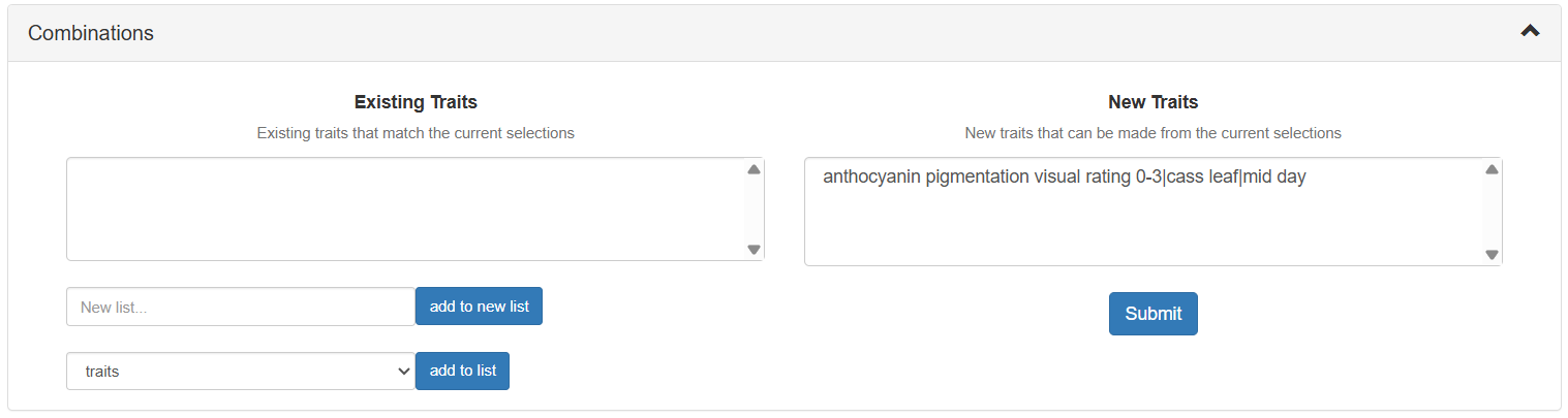 To proceed, select one or more term from each box. At the bottom of the page, you will see existing composed traits that match your selections as well as the new composed traits that can be made. Select one or more of the possible new composed traits and click ‘Submit’ to create them.