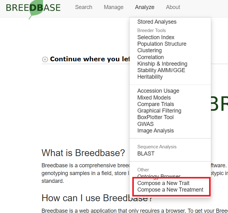 Before setting out to introduce new traits, visit the trait search page under the Search tab to make sure it isn’t already present. Once a set of traits, methods, units, scales, and other terms have been added to the database, they can be composed into an observation variable from the Analyze tab under Compose a new trait.
